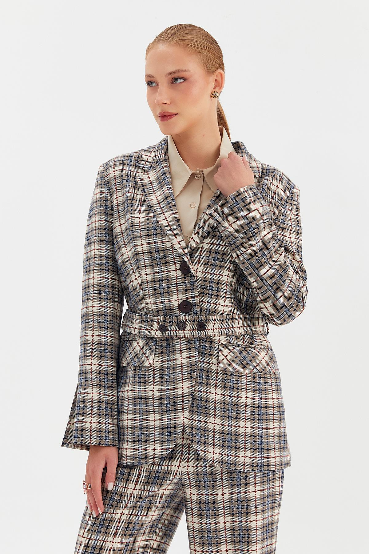 Ürün Açıklaması 2 düğmeli, beli kemerli, ekose ceket.
