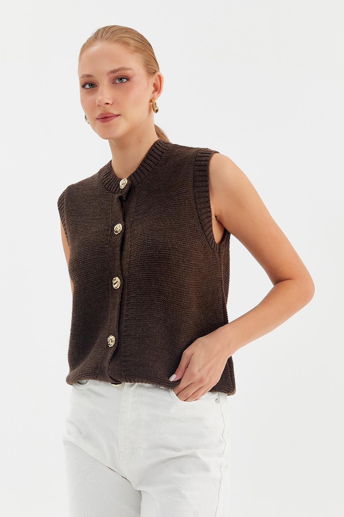 Bisiklet Yaka Düz Örgü Yelek (51005q_Kahverengi)