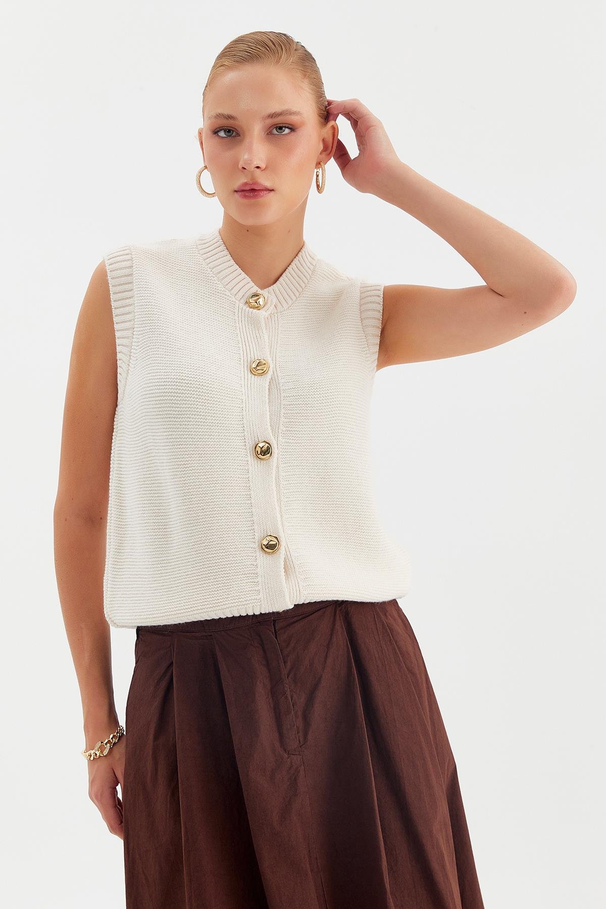 Ürün Özellikleri 5 düğmeli, bisiklet yaka, düz örgü, süveter yelek.