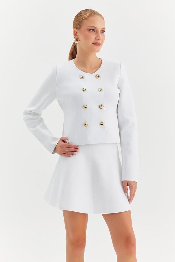 Ürün Açıklaması 8 düğmeli, kendinden yakalı, çelik örme ceket ve çelik örme mini çan etek.