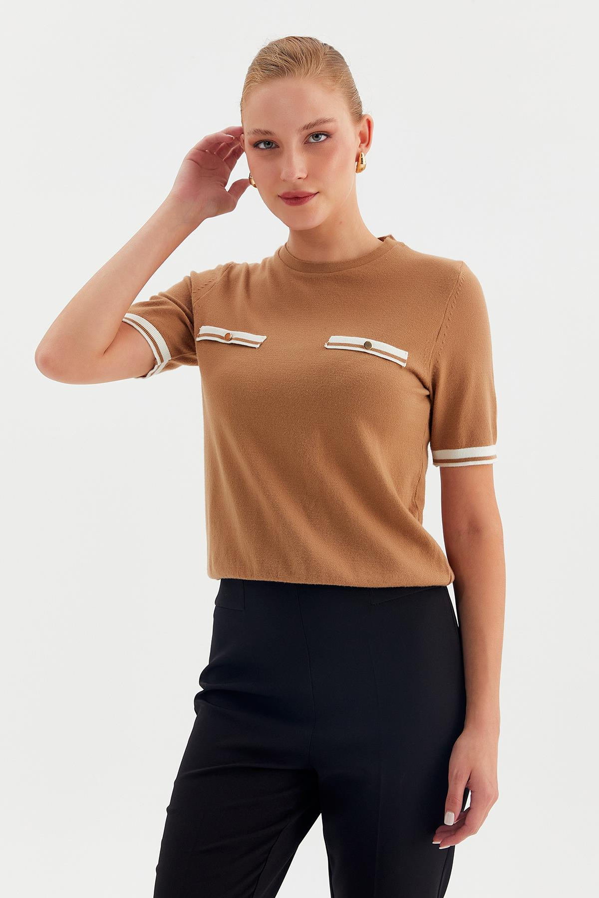 00343 Cep Detaylı Bisiklet Yaka Kısa Kollu Triko