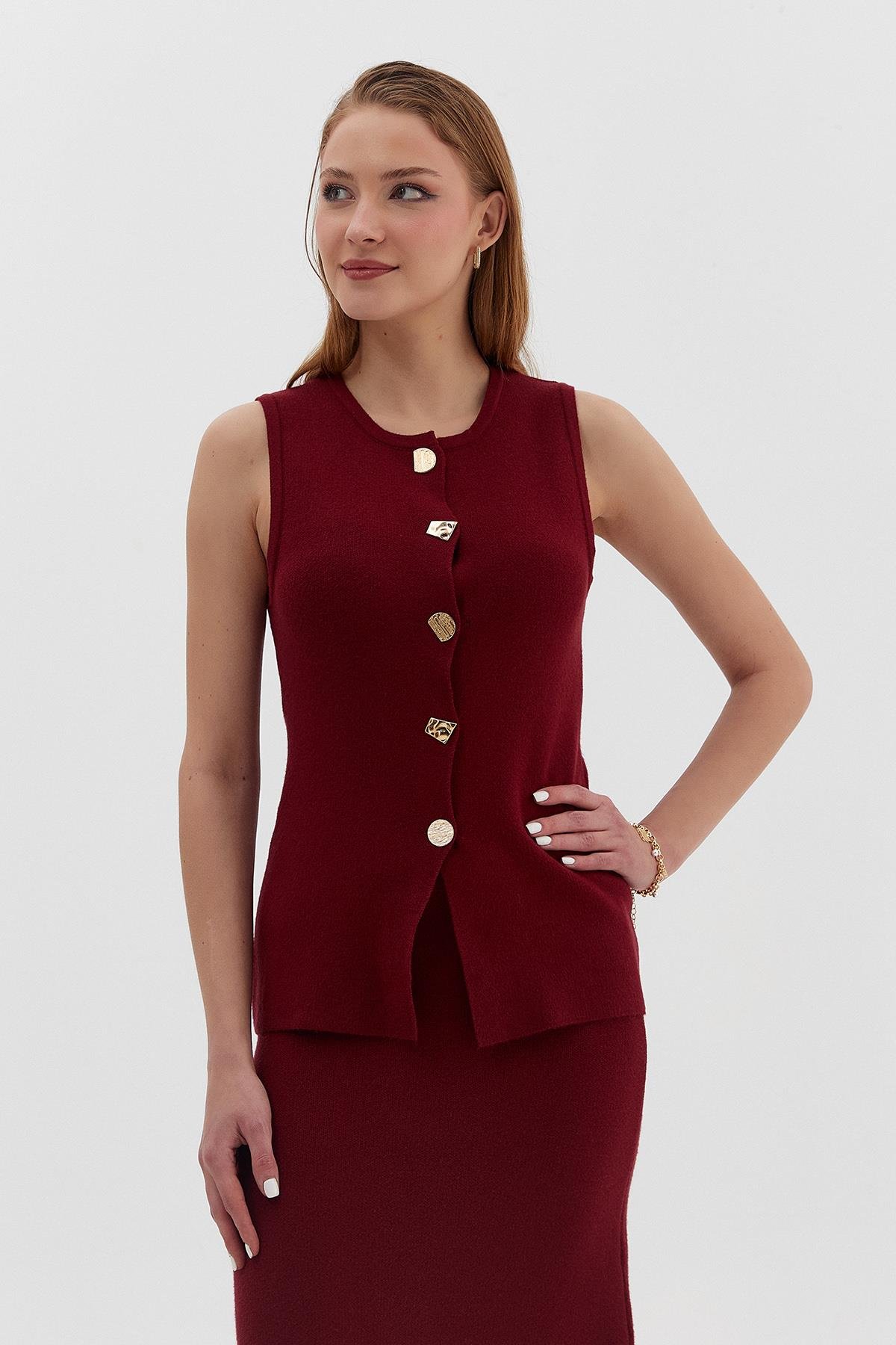 Bisiklet yaka, düğmeli, triko yelek.