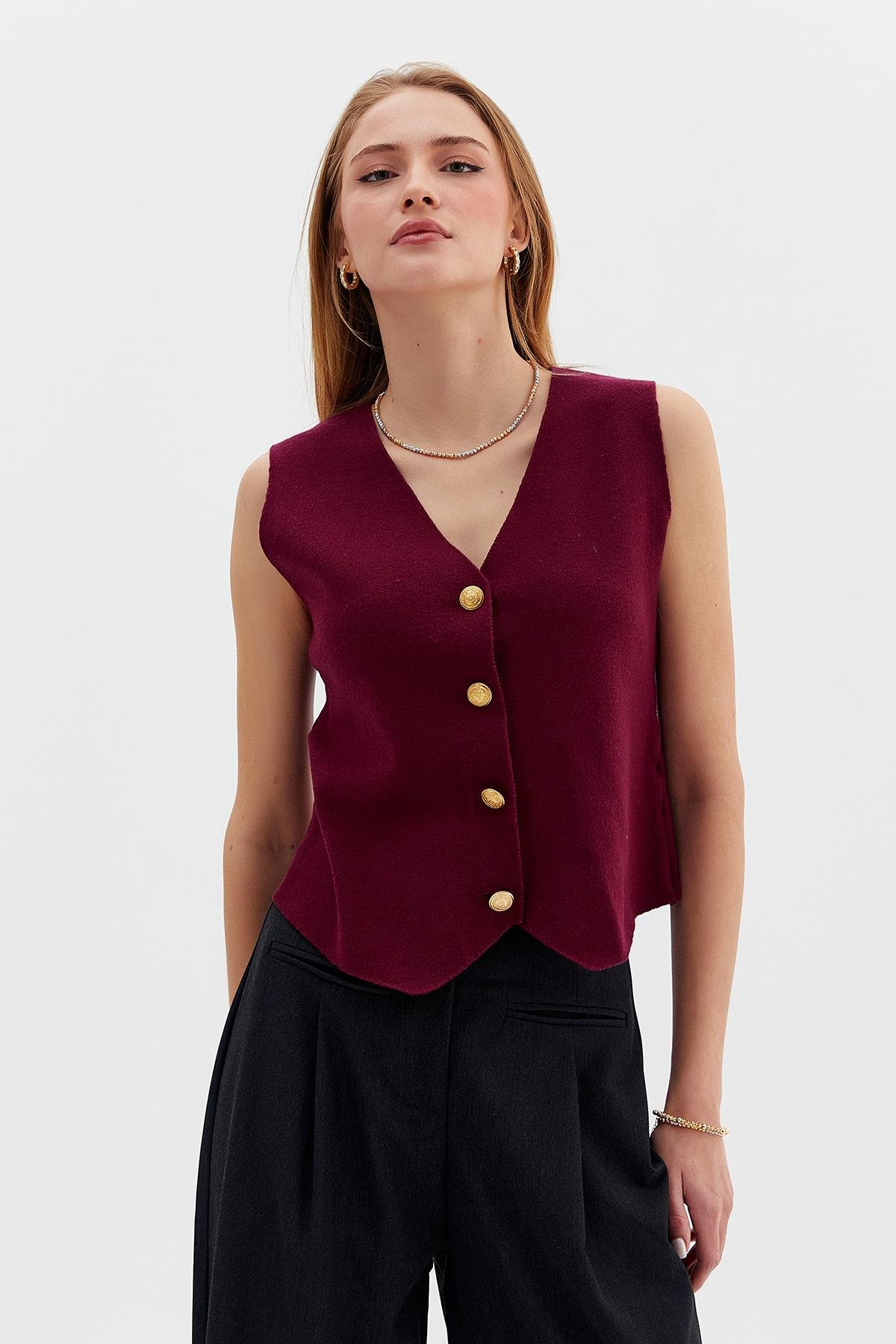 Gold Düğmeli Triko Yelek (00844_Bordo)