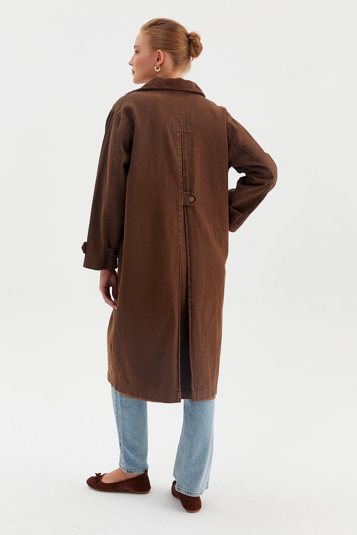Ürün Açıklaması Kadife yakalı, çıtçıtlı, eskitme görünümlü, jean trençkot.