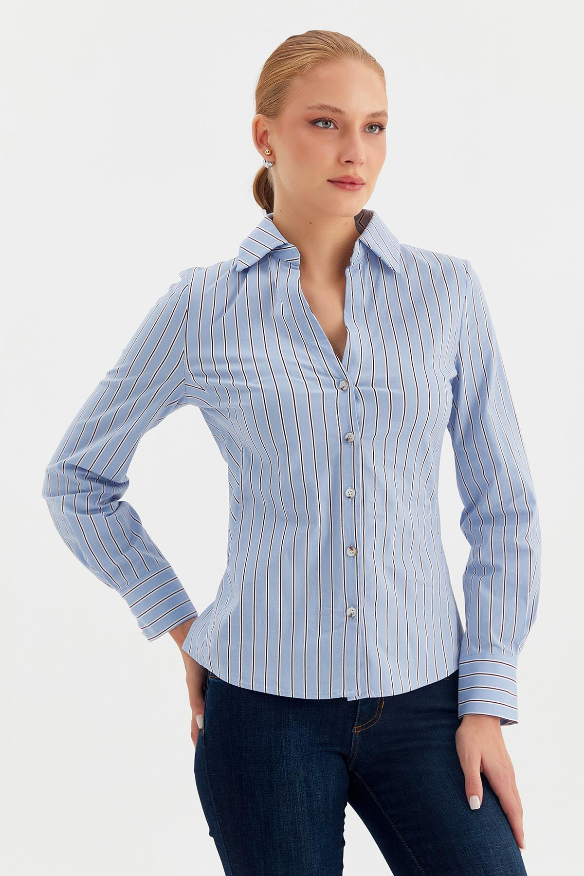 Ürün Özellikleri Bele oturan, V yaka, oxford gömlek.