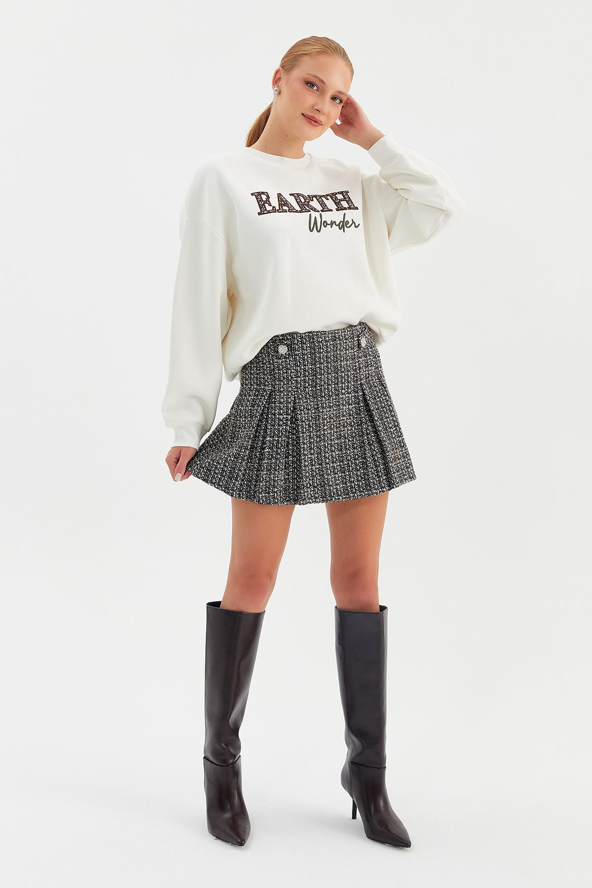 Ürün Özellikleri Kapalı pileli, süs düğmeli, volanlı, tüvit, mini etek.