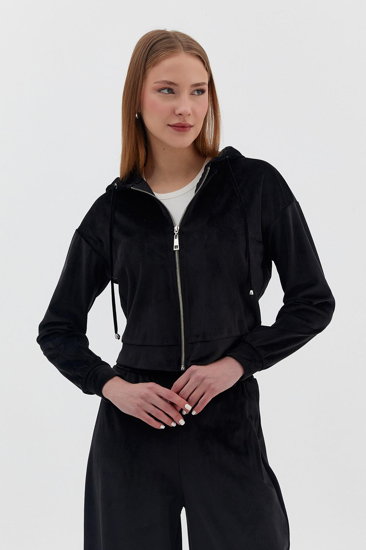 Fermuarlı, kapüşonlu kısa sweatshirt.