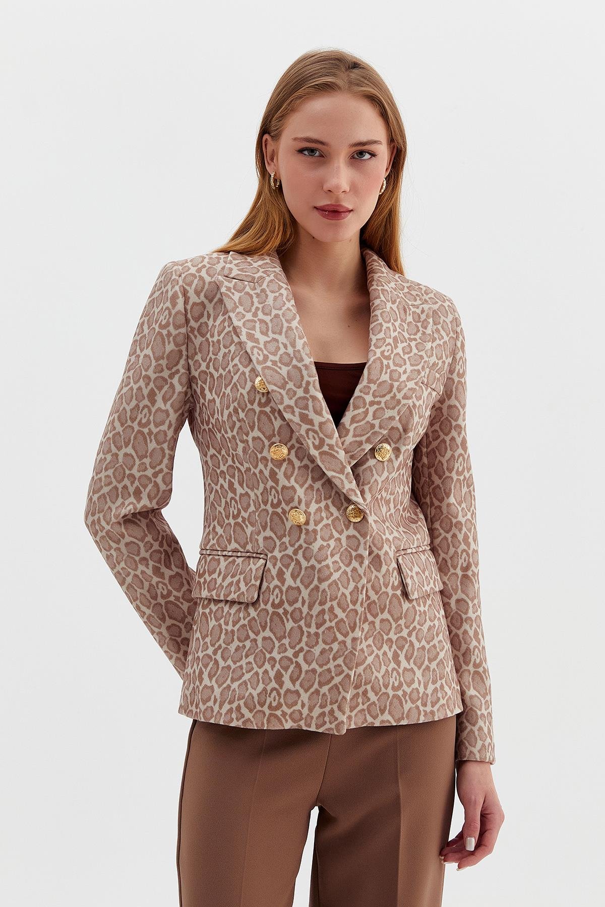 Ürün Açıklaması Leopar desenli, gold düğmeli, kruvaze kesim kadın ceket.