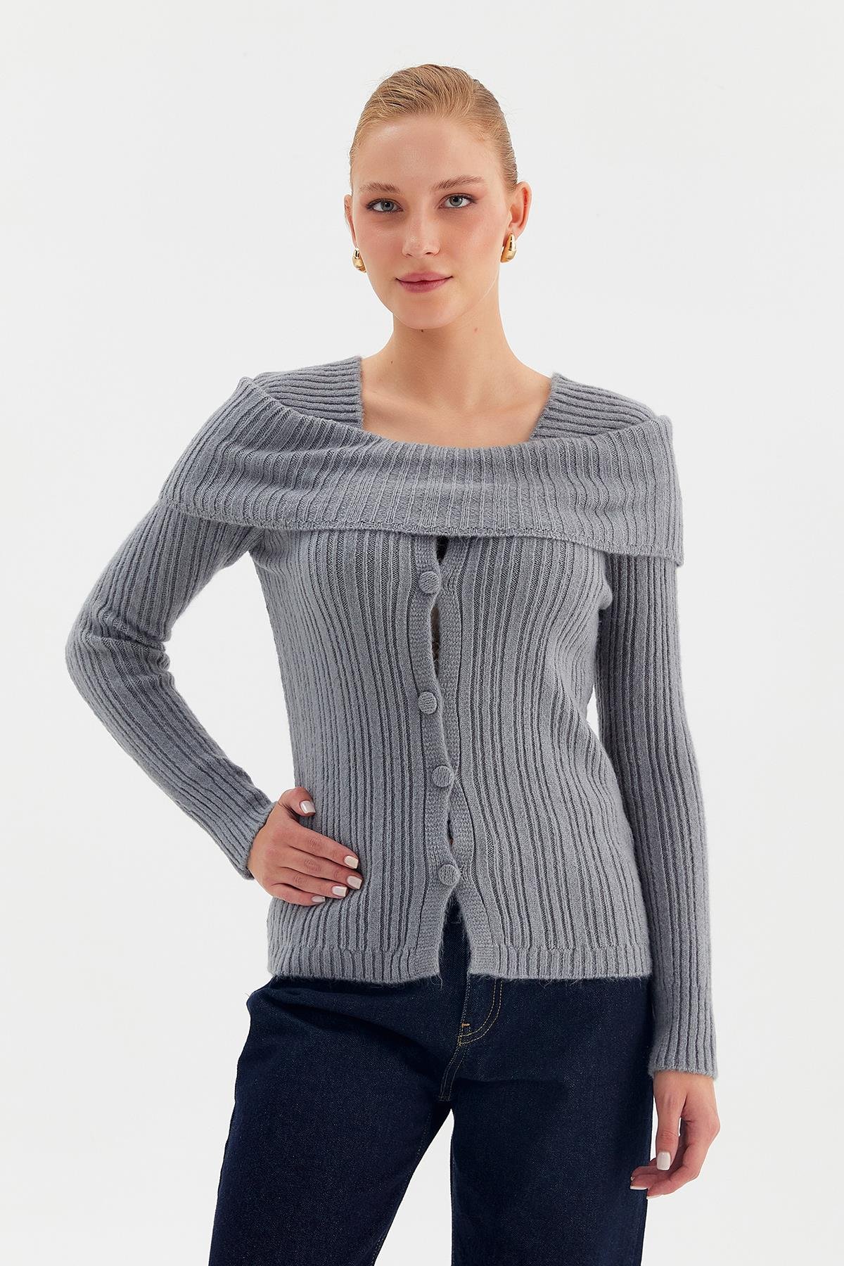 Ürün Açıklaması Madonna yaka, düğmeli, uzun kollu, örgü hırka.