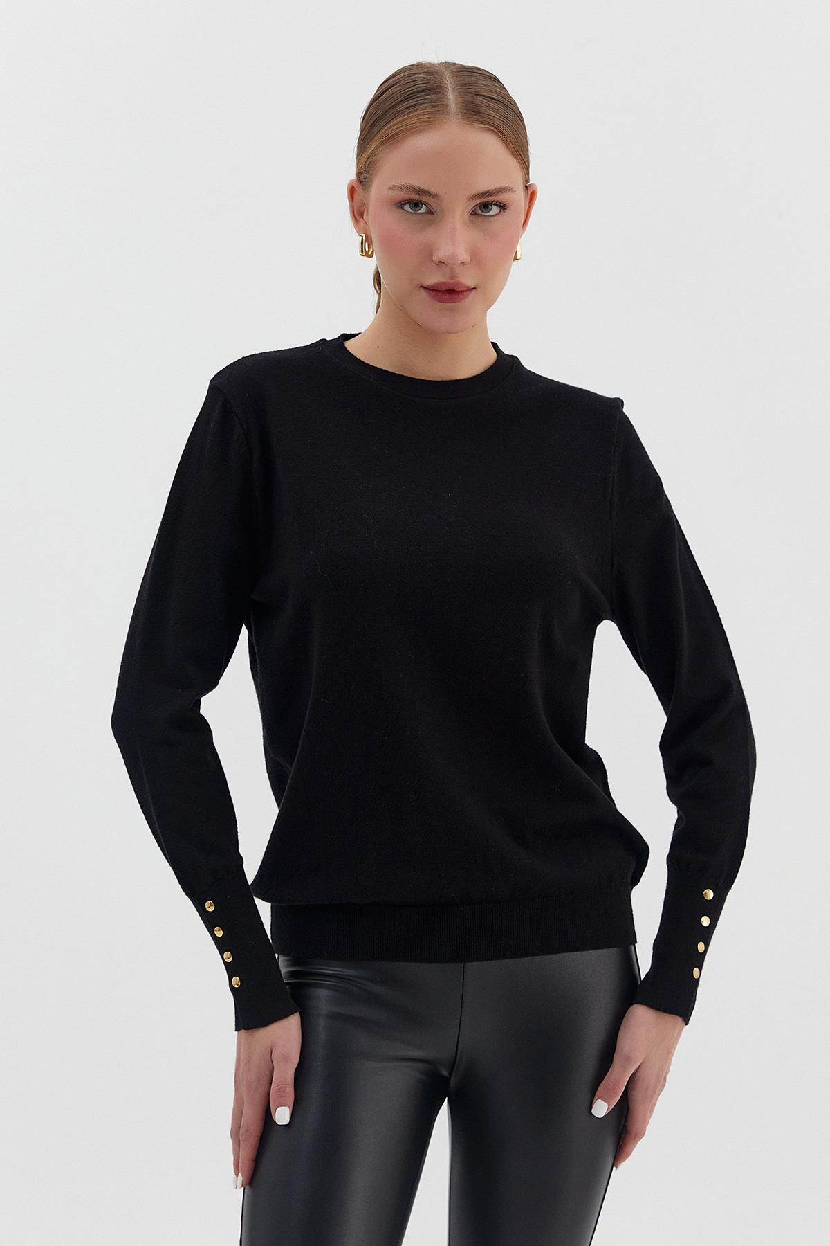 Manşetleri Düğmeli Bisiklet Yaka Triko (00745_Siyah)