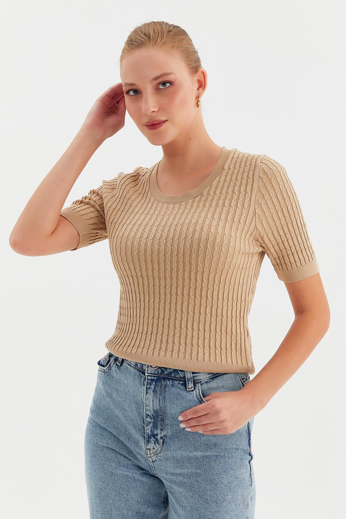 Saç Örgü Bisiklet Yaka Kısa Kolu Triko (00312_Camel)