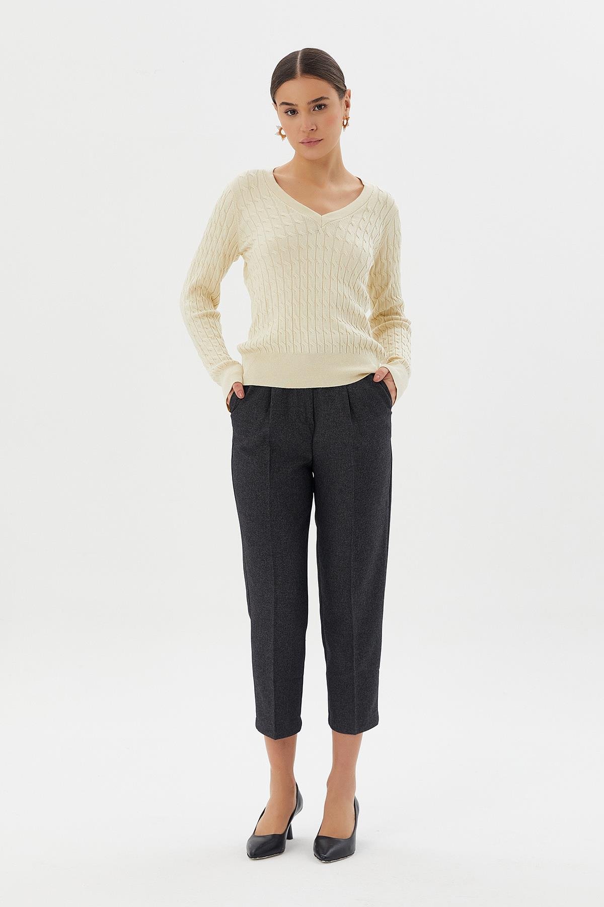 Saç örgü, v yaka ince triko.