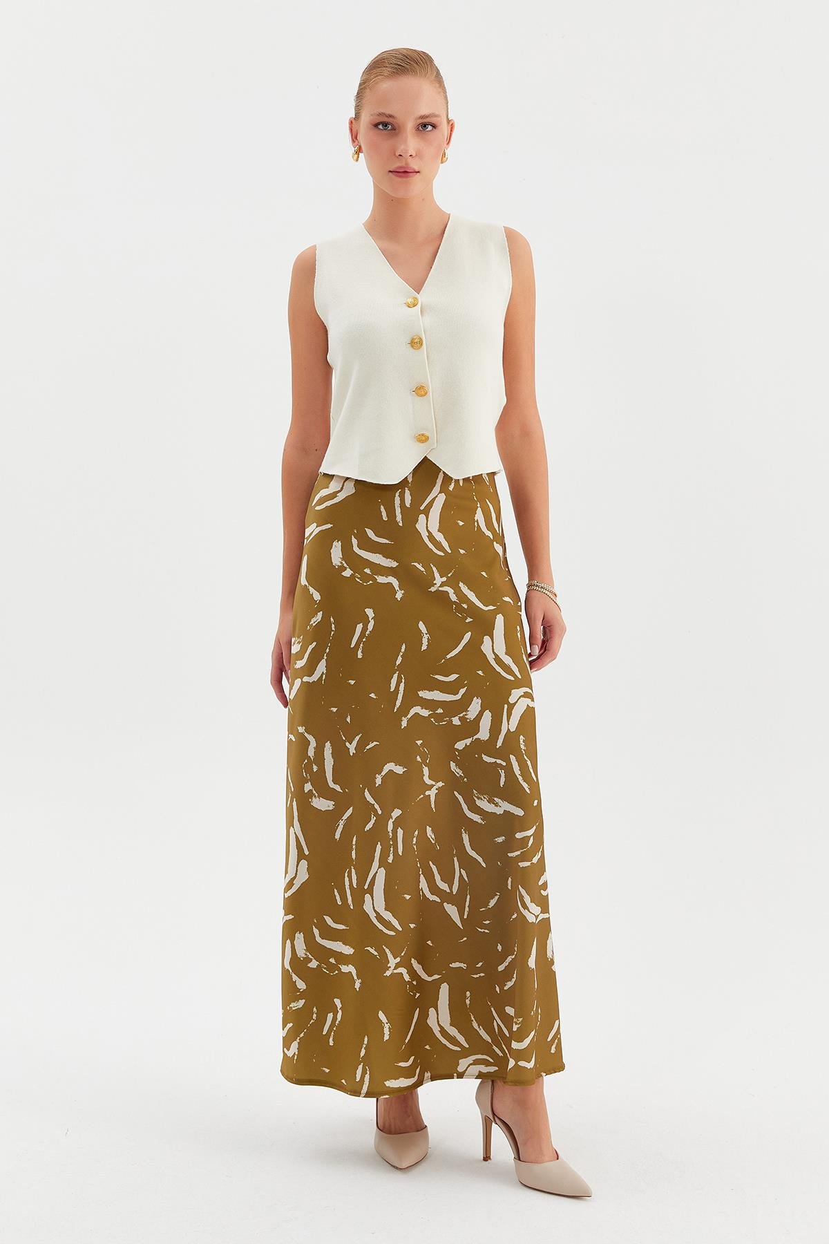 Taş Baskı Saten Maxi Etek (39108_Olive)