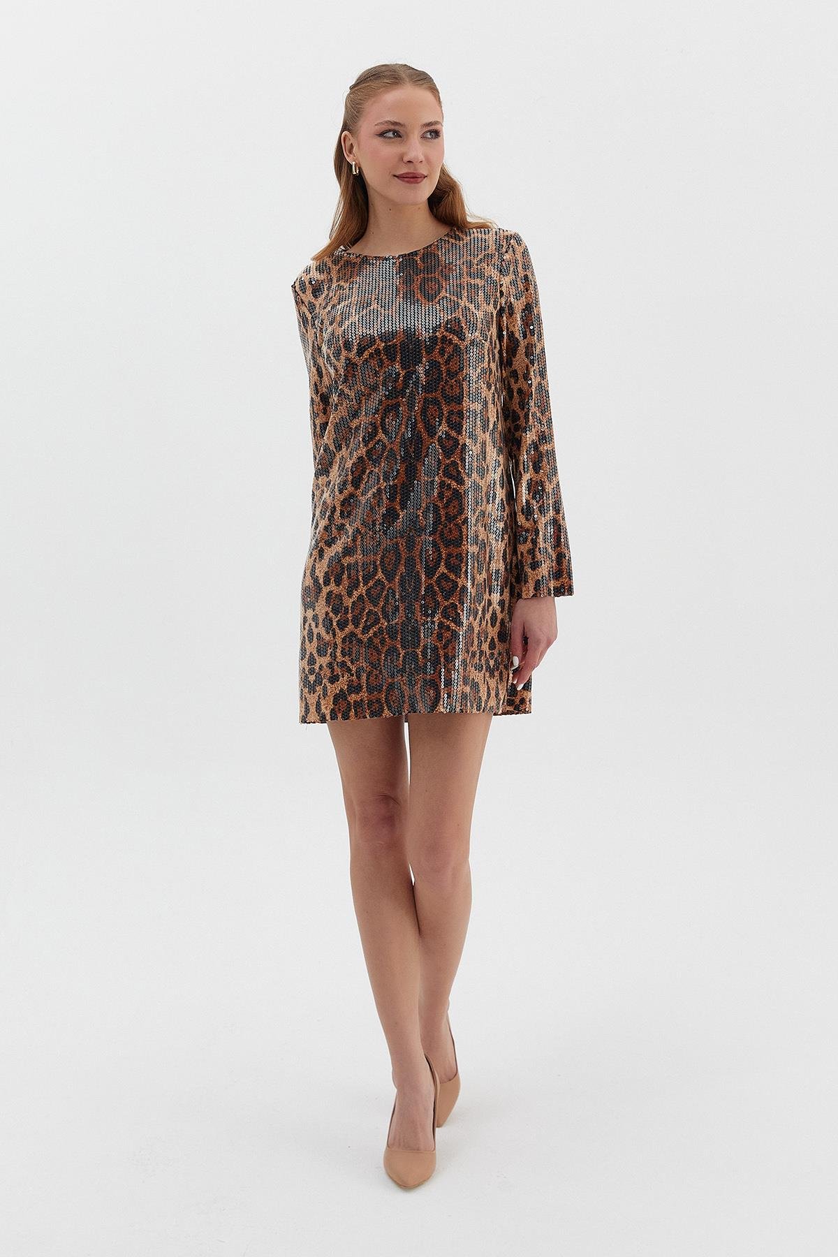 Uzun Kollu Payetli Leopar Mini Elbise (K5522_Leopar)