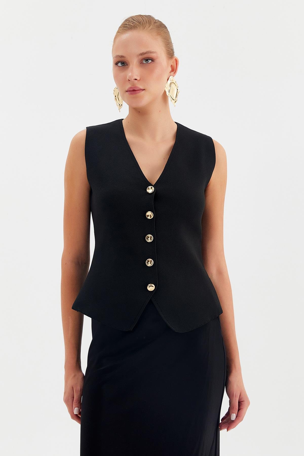 V Yaka Gold Düğmeli Yelek (51011_Siyah)