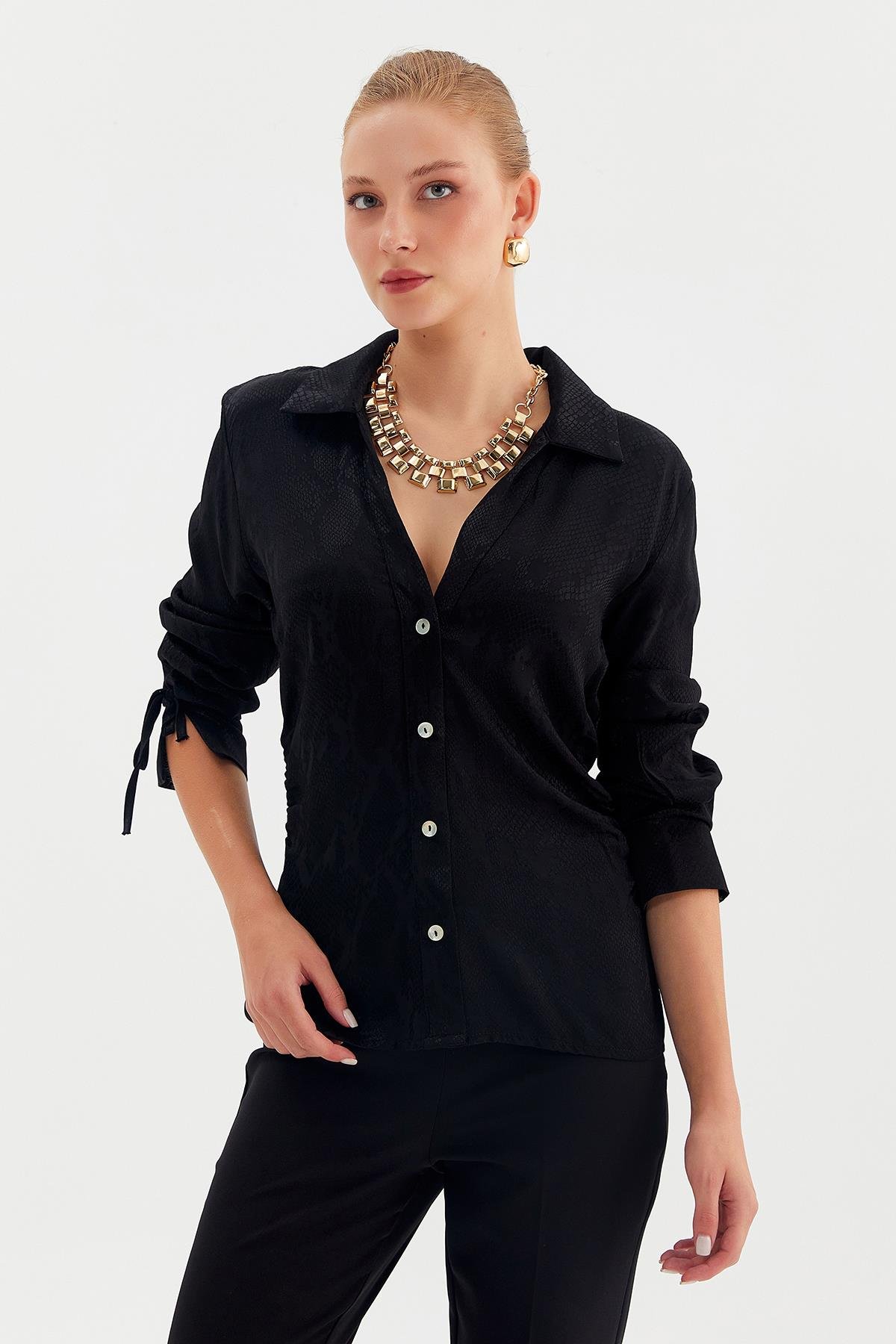 Ürün Açıklaması Yılan derisi desenli, manşetleri ip bağlamalı, v yaka gömlek.