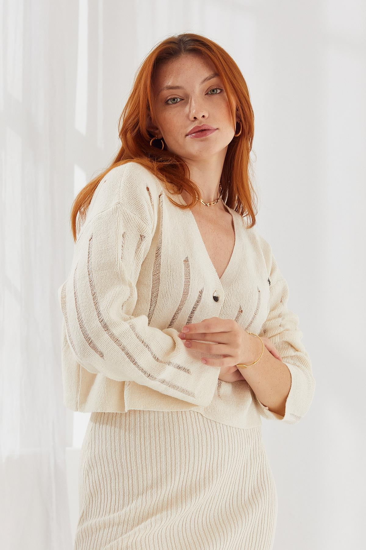 Yırtık Detaylı Düğmeli Triko Hırka (4011Z_Ham Ekru)