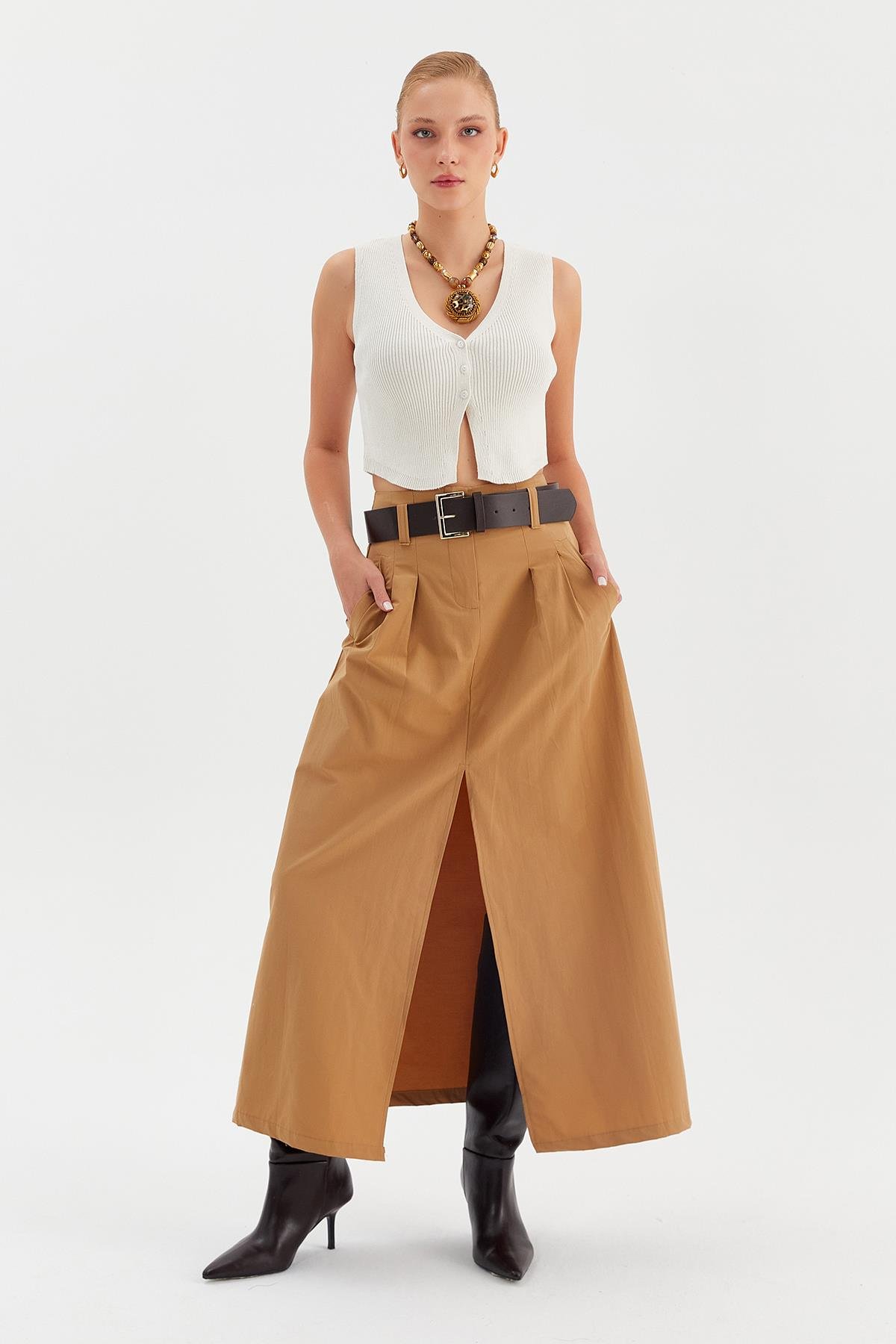 Önden yırtmaçlı, cepli, beli kemerli, pileli, maxi etek.